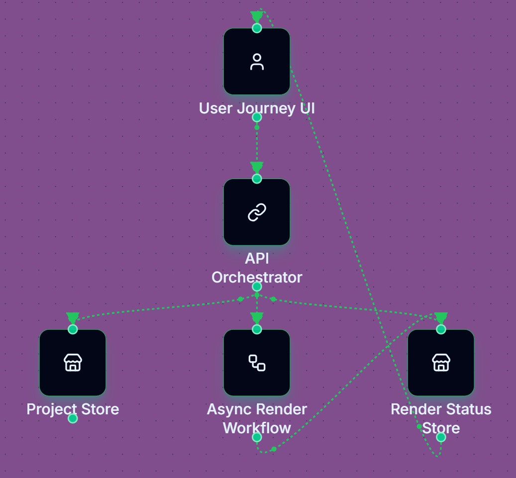 These are the Project Store and Render Status Store boxes. They give the system memory: projects are saved here, render progress is saved here, and final video links live here—so nothing is lost if a user refreshes or comes back later.