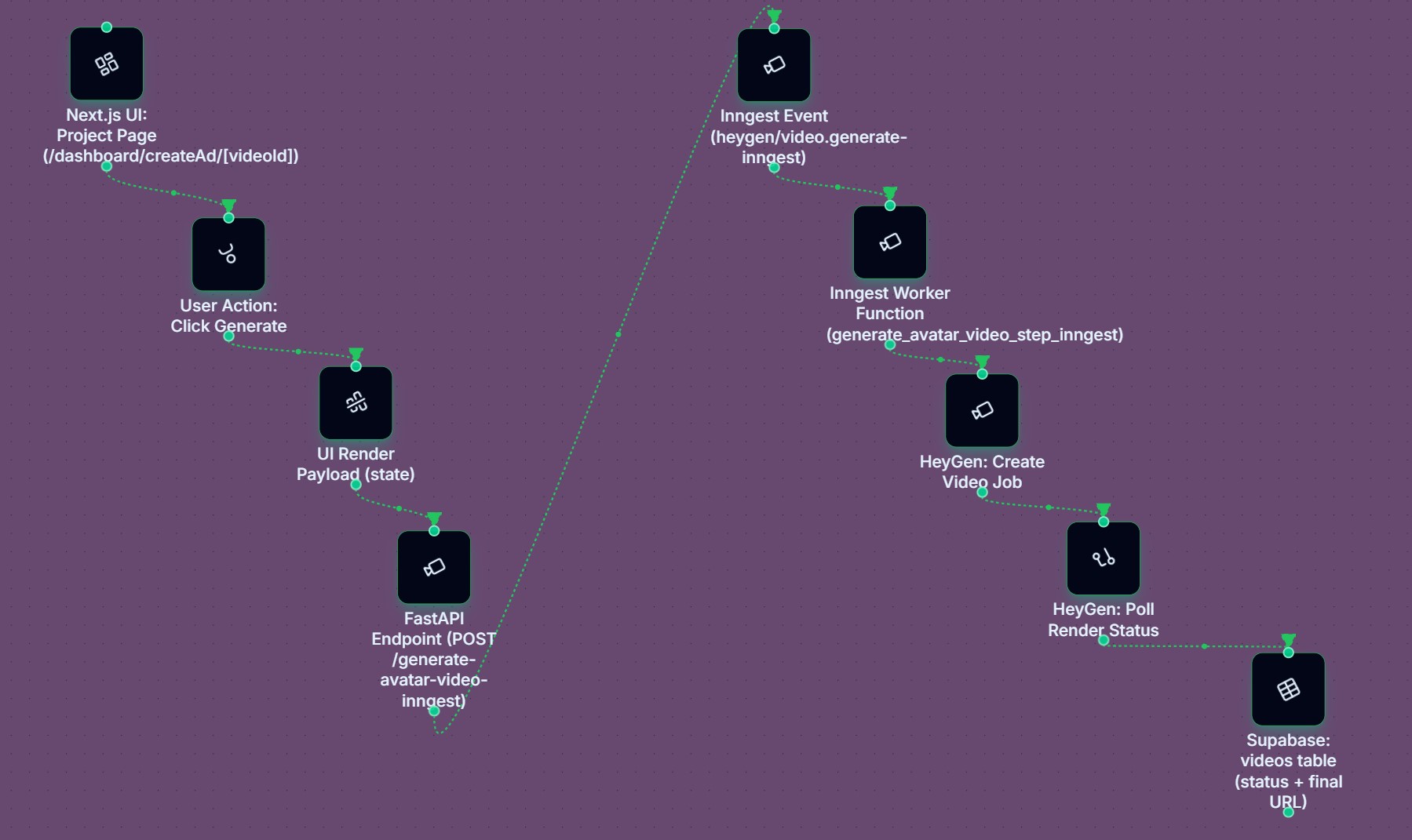 This is the full journey from idea to finished video. The goal is to show the AI video ad generator end-to-end without getting lost in low-level server details. Think of it as the product flow from a builder’s point of view.