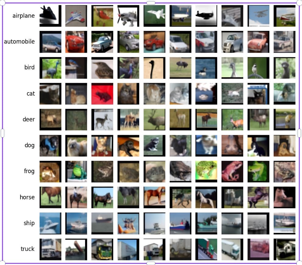 The dataset also permits various data augmentation techniques such as cropping, flipping, rotating, and adding noise. These augmentation techniques can be used to improve the generalization and robustness of the models. The figure below illustrates the various classes of images in the CIFAR-10 dataset.