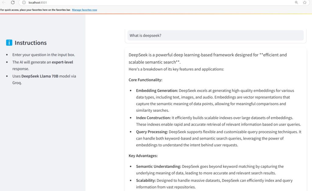 Here's what our app looks like when someone asks "What is DeepSeek?" The AI responds with a detailed, professional answer using the DeepSeek Llama 70B model: