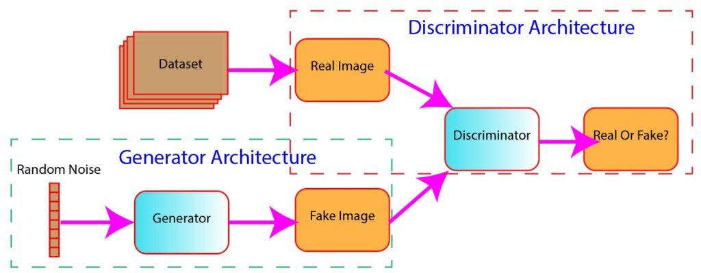 The architecture of Generative Adversarial Networks consists of two main components: generator and discriminator. In the section below, we will briefly explain both the components.