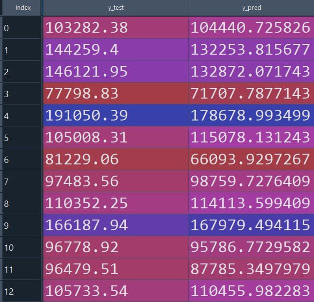 print(df)The table below compares the value of the observed value of the dependent variable (y_test) with the predicted value of the dependent variable (y_pred). As we can see, the regression model seems to be performed very well in predicting the dependent variable.