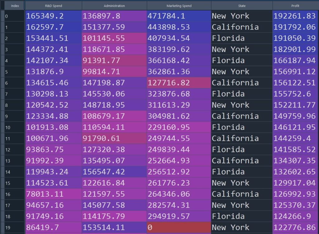 Figure 2: Startup dataset (sample rows) used for multiple linear regression