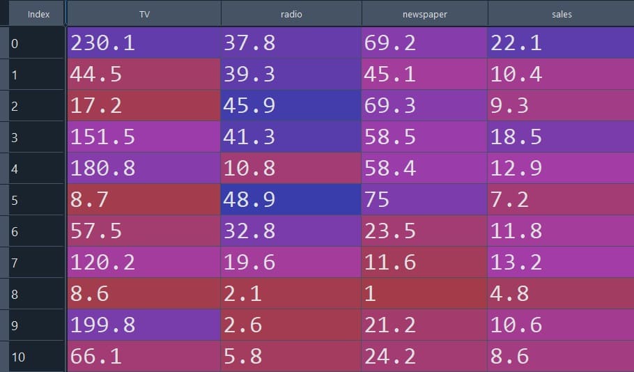 Here, we will develop another regression model with multiple independent variables. This problem has three independent variables (TV, radio, newspaper) and one dependent variable (sales). Our aim is to find the relationship between the independent and dependent variables. The dataset consists of 200 rows and 4 columns. In the table below, we have shown the partial datasets for visualization of the data.