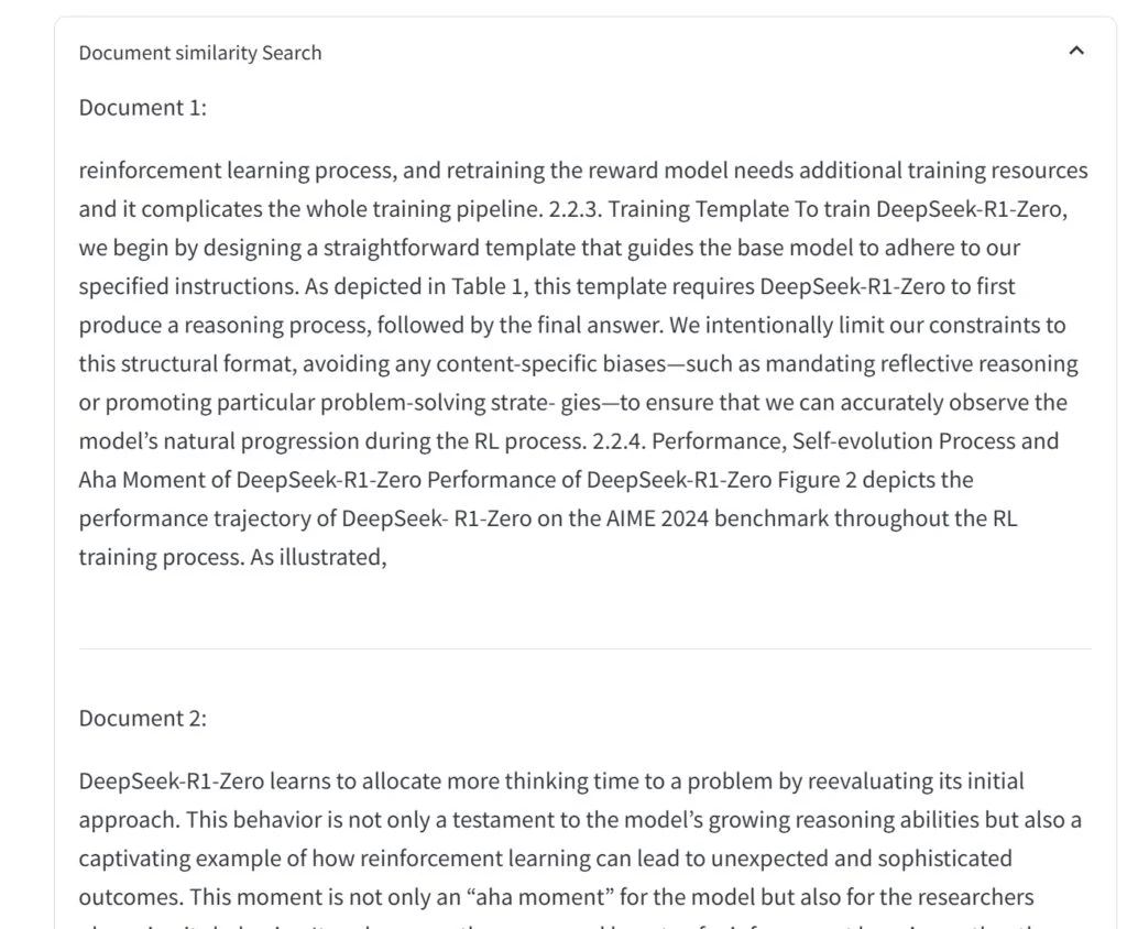 Expandable Section for Similarity Search → Shows retrieved documents along with similarity scores. Helps the user verify the AI’s response by checking which document parts contributed to the answer.