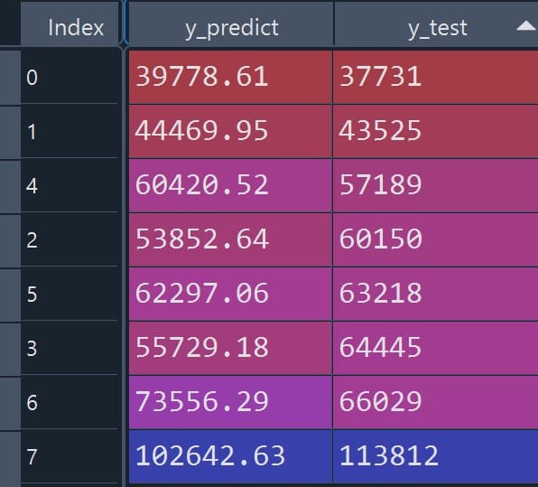 print(comparison)The table below compares the predicted value (y_predict) of the dependent variable with its observed value (y_test).