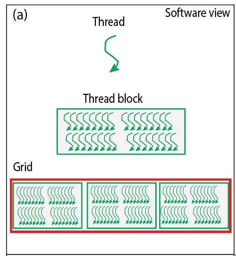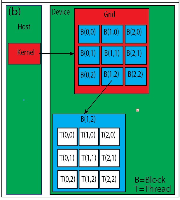 Fig. 1. (a) Thread hierarchy overview showing the relationship between grids, blocks, and threads (b) Detailed organization of threads within blocks and grids