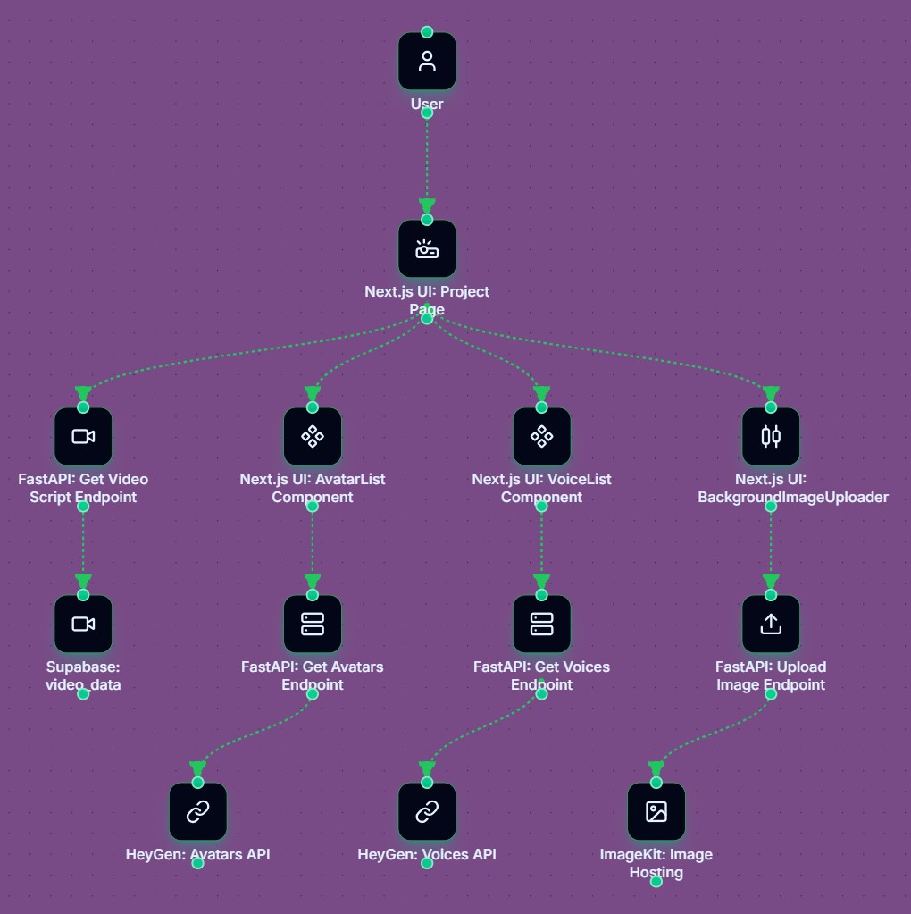 - HeyGen (Video Provider): Provides avatars and voices, and performs the talking-avatar video rendering.