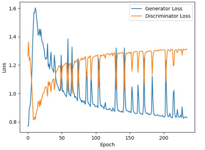 We also observe that the discriminator losses decrease initially (in the first few epochs). In the initial phase of training, the discriminator can easily identify fake images, which are often low-quality, generated by the generator. However, as the training advances, the discriminator losses gradually increase and stabilize. This implies that the discriminator faces increasing difficulty in identifying fake images as fake, possibly due to the generator producing more realistic fake images.