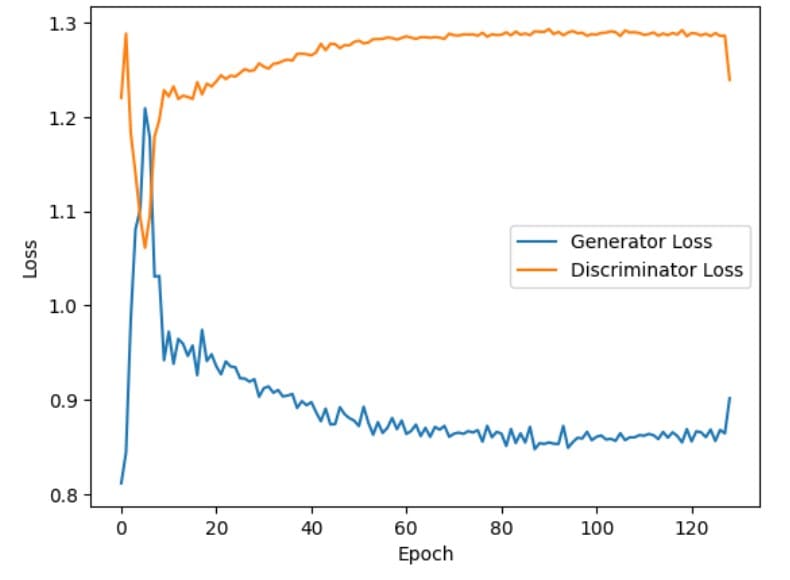 Conversely, the discriminator losses decrease initially (within the first few epochs). This indicates that the discriminator quickly becomes efficient at distinguishing between real and fake images. However, as training advances, the discriminator losses increase gradually and stabilize. This implies that the discriminator faces increasing difficulty in identifying fake images as fake, possibly due to the generator producing more realistic fake images.