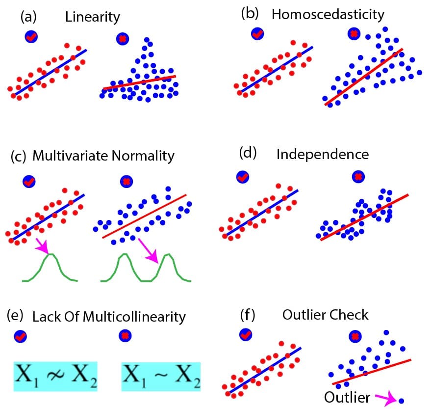 We can also summarize various assumptions of multiple linear regression discussed above with the help of the following diagram below. The diagram below shows six concepts that should be met for multiple linear regression: linearity, homoscedasticity multivariate normality, independence, lack of multicollinearity, and the outlier check. In the figure, each concept is illustrated with the help of two examples: one that satisfies the assumption and one that violates the assumptions.