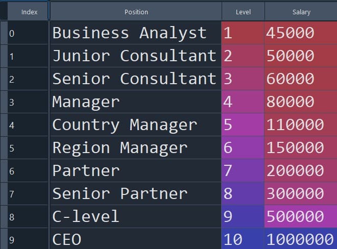 The table shows the different job positions, their levels, and corresponding salaries. The table has four columns: Index, Position, Level, and Salary. We will use the ‘Level’ column as the independent variable and the ‘Salary’ column as the dependent variable.