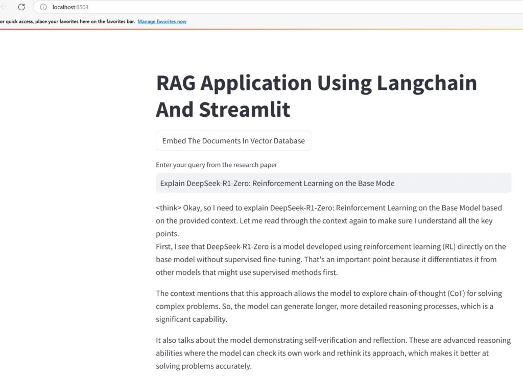 In this article, we successfully developed a Retrieval Augmented Generation (RAG) application using LangChain, DeepSeek, and Streamlit.